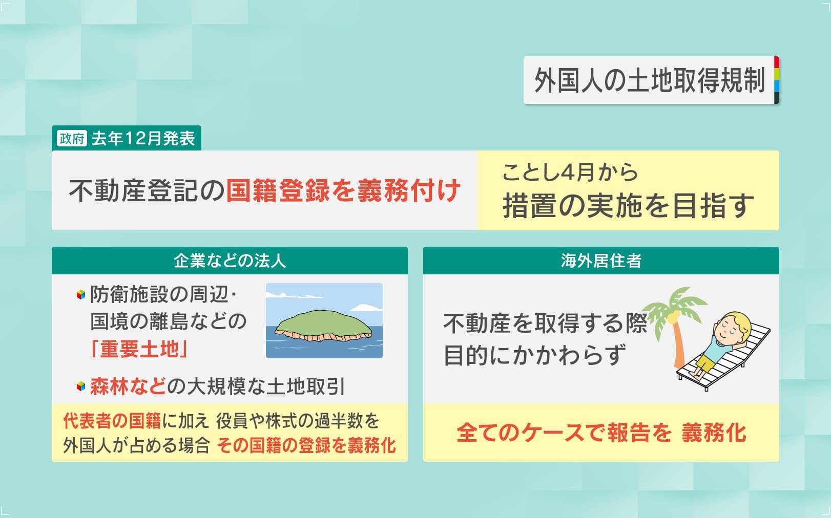2025年12月、政府は「不動産登記の国籍登録を義務付け、2026年4月から措置の実施を目指す」と発表しました。企業などの法人は、『防衛施設の周辺・国境の離島などの重要土地』『森林などの大規模な土地取引』の際には、代表者の国籍に加え役員や株式の過半数を外国人が占める場合、その国籍の登録を義務化。海外居住者は、不動産を取得する際、目的にかかわらず全てのケースで報告を義務化となっています。