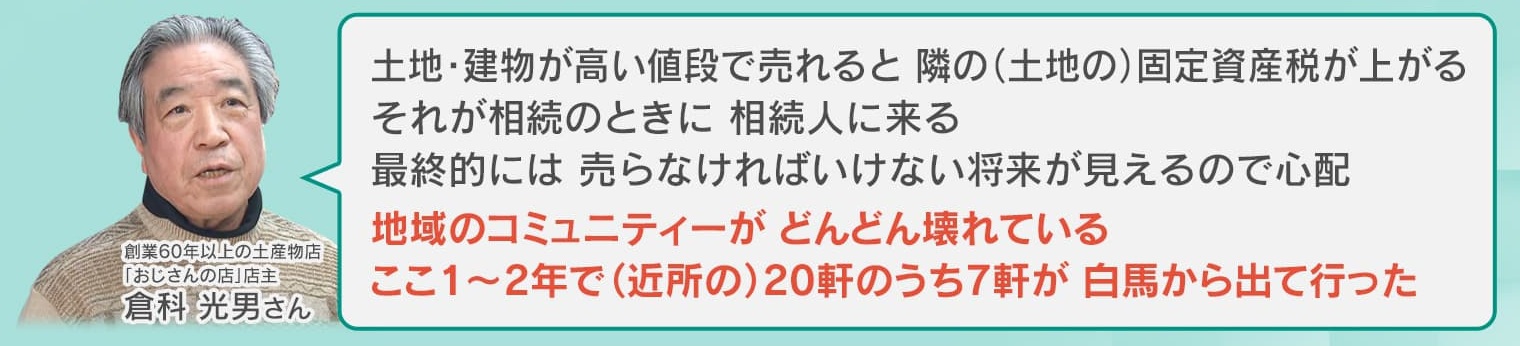 また、急激な地価の高騰などに対し、一部の住民からは戸惑いの声もあがっています。創業60年以上の土産物店『おじさんの店』店主・倉科光男さんは、「土地・建物が高い値段で売れると、隣の土地の固定資産税が上がる。それが相続のときに相続人に来る。最終的には売らなければいけない将来が見えるので心配。地域のコミュニティーが、どんどん壊れている。ここ1~2年で近所の20軒のうち7軒が白馬から出て行った」と話していました。
