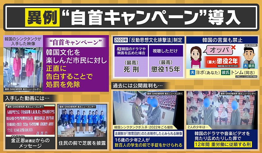 韓国のシンクタンクが入手した北朝鮮国内で流れている映像によると、今北朝鮮では“自首キャンペーン”なるものが行われていて、韓国文化を楽しんだ市民に対し、「正直に告白することで処罰を免除します」としているそうです。これまでの北朝鮮は、2020年に「反動思想文化排撃法」が制定され、韓国のドラマや映画を広めた場合、最高で死刑、視聴しただけでも最長で懲役15年、韓国の言葉も禁止で男性パートナーに「オッパ」という言葉を使っただけで最高懲役2年などとなっていました。過去には16歳の少年2人が韓国のドラマや音楽ビデオを見たり広めたりした罪で、数百人の学生の前で手錠をかけられ、12年間の重労働に従事する刑に処せられたこともありました。