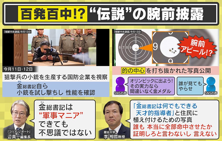 「金総書記は、金日成総合軍事大学を出ています。彼は2023年8月にもこの工場を訪れて試し撃ちをしています。この時は的の写真や映像は出ませんでした。今回2回目なんですが、おそらく1回で全部命中させたということではなく、2回3回やってその中で当たったと見ています。金総書記が製品の合格を承認しないといけないので、自ら撃って当たったというのを証明しているのだと思います。金総書記は、戦車や潜水艦、ミサイル発射台にまで乗っている“軍事マニア”なので、今回の件もウソではないと個人的には思っています」