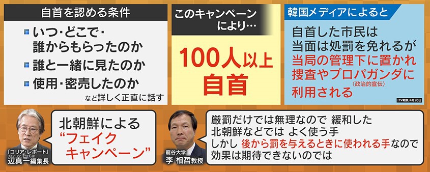 自首を認める条件は、「いつ・どこで・誰からもらったのか?誰と一緒に見たのか?使用・密売したのか?」などを詳しく正直に話なければなりません。自首した人は100人以上いるということですが、韓国メディアによると「自首した市民は当面は処罰を免れるが、当局の監視下に置かれ捜査やプロパガンダに利用される」としています。辺氏は「北朝鮮による“フェイクキャンペーン”」だと指摘しています。李教授は「厳罰だけでは無理なので緩和した。北朝鮮などでよく使う手。しかし、後から罰を与えるときに使われる手なので、効果は期待できないのでは」と話しています。