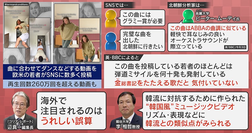 この曲に合わせてダンスなどをする動画を欧米の若者がSNSに数多く投稿し、中には再生回数が260万回を超える動画もあるということです。SNSでは、「この曲にはグラミー賞が必要」「完璧な曲を出した北朝鮮に行きたい」という声もあがっています。北朝鮮分析家の高麗大学 ピーター・ムーディ氏は、「この曲はABBAの曲調に似ている。軽快で耳なじみの良いオーケストラサウンドが際立っている」と分析しています。また、龍谷大学の李相哲教授は、「韓流に対抗するために作られた“韓国風”ミュージックビデオ。リズム・表現などに韓流との類似点がみられる」としています。BBCは「この曲を投稿している若者のほとんどは、弾道ミサイルを何十発も発射している金総書記をたたえる歌だと気付いていない」と報じています。辺氏によると「海外で注目されるのは(北朝鮮にとって)嬉しい誤算」だとしています。