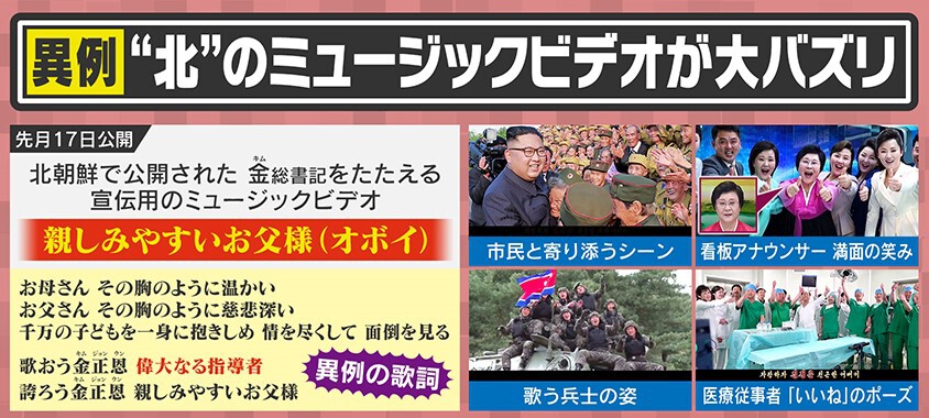 4月、北朝鮮で公開された金正恩総書記をたたえる宣伝用のミュージックビデオ「親しみやすいお父様(オボイ)」ですが、金正恩総書記を呼び捨てにするなど異例の歌詞となっていて、曲調もアップテンポの明るいものとなっています。