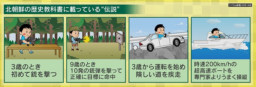 北朝鮮の歴史教科書に金正恩総書記は「3歳のとき初めて銃を撃つ」「9歳のとき10発の銃弾を撃って正確に目標に命中させる」や「3歳から運転をはじめ険しい道を疾走」「200km/hの超高速ボートを専門家よりうまく操縦」と“伝説”が載っているそうです。また、父親の金正日総書記は、ゴルフの初ラウンドで「11回のホールインワン」「(世界記録?)38アンダーを記録」したということです。