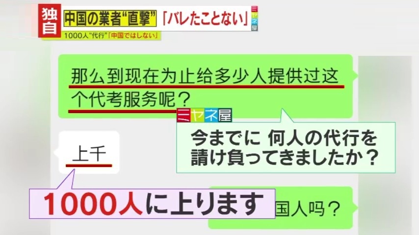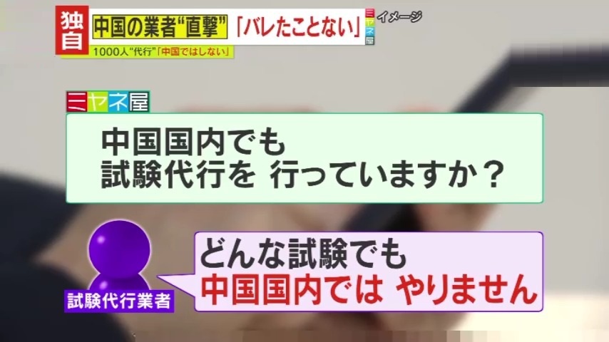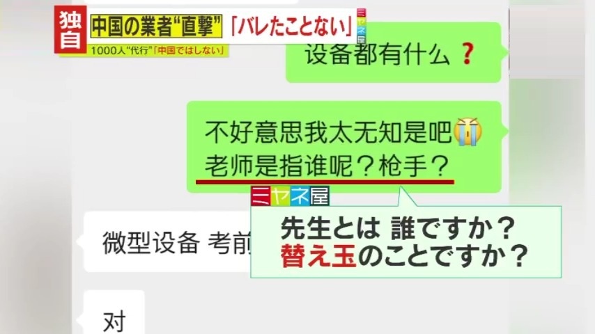 -『オフライン、替え玉受験は5.9万元(約118万円)。まず半額を前払いし、担当の先生をマッチングします。スコア発表後に、残りの半額を支払ってもらいます』