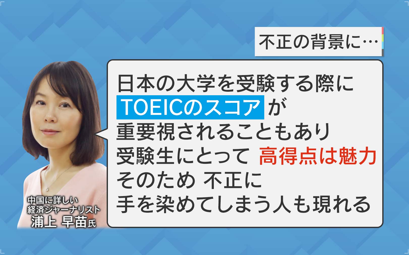 不正の背景について、中国に詳しい経済ジャーナリスト・浦上早苗氏は、「日本の大学を受験する際にTOEICのスコアが重要視されることもあり、受験生にとって高得点は魅力。そのため不正に手を染めてしまう人も現れる」との見解を示しています。