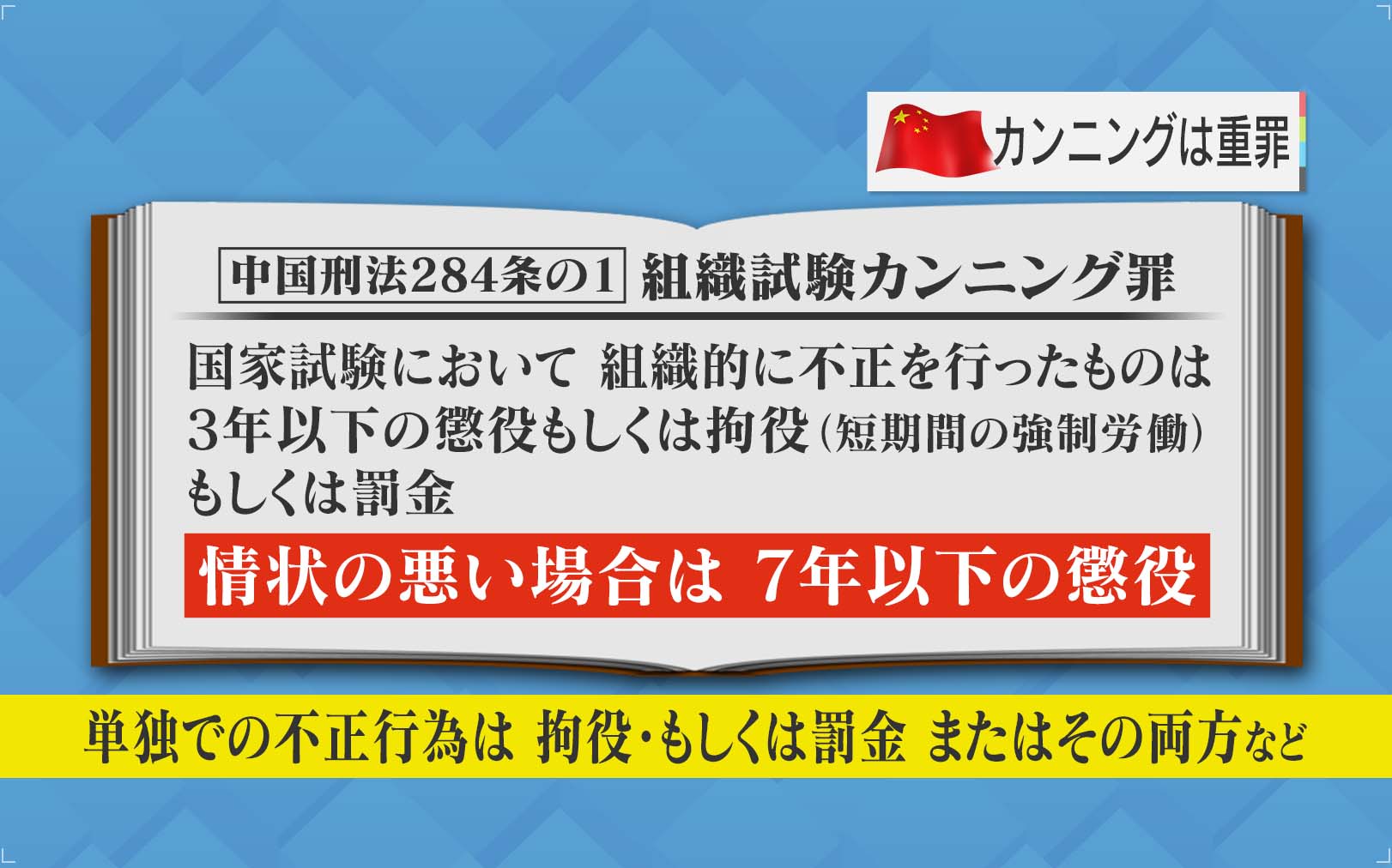 中国刑法284条の1『組織試験カンニング罪』には、「国家試験において、組織的に不正を行ったものは3年以下の懲役もしくは拘役(短期間の強制労働)もしくは罰金」とあり、情状の悪い場合は7年以下の懲役が科されます。