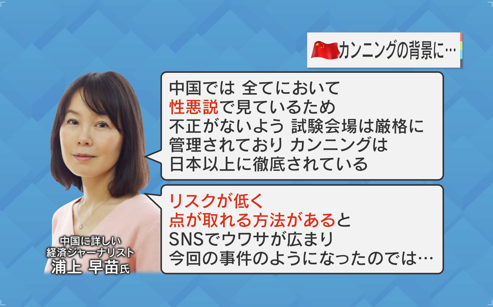カンニングの背景として、浦上氏は「中国では全てにおいて性悪説で見ているため、不正がないよう試験会場は厳格に管理されており、カンニングは日本以上に徹底されている」「リスクが低く点が取れる方法があるとSNSでウワサが広まり、今回の事件のようになったのでは」とみています。