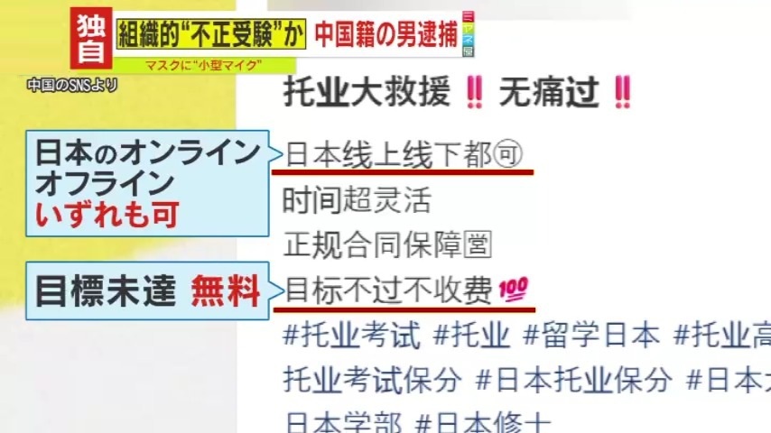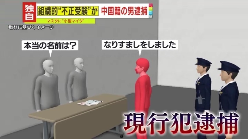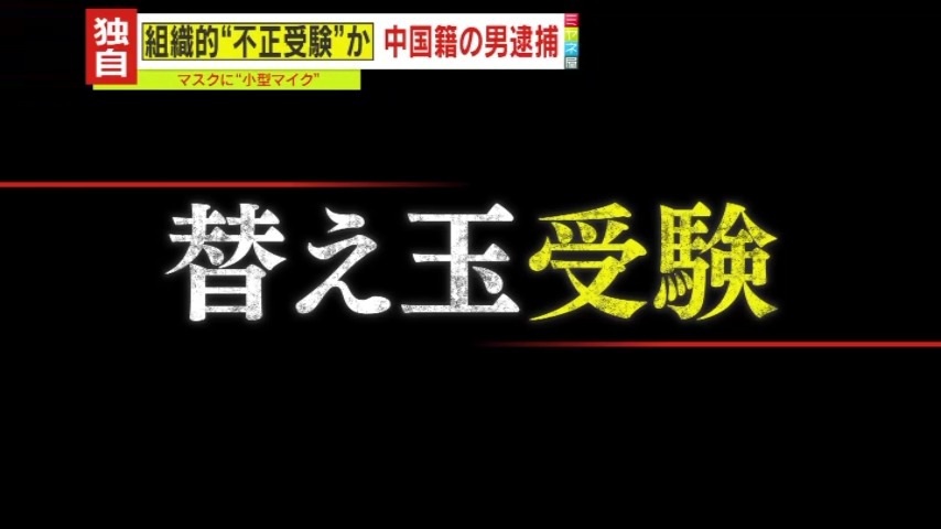 中国国籍の男は、「『英語の試験を受けろ』と中国語で指示を受けた。駅で偽造学生証を渡してきたのは中国人だった」と供述し、男のマスクには約3~4cmの小型マイクが仕込まれていて、“別の受験者に解答を教える目的”があったとみられています。また、男との関連は不明ですが、同じ会場の受験予定者の約3割が欠席したということで、警視庁は『組織的なカンニング事件』とみて捜査を進めています。