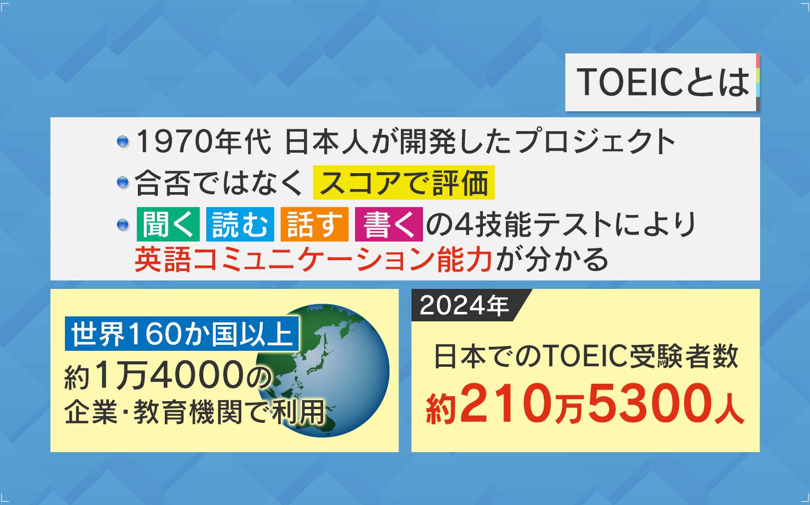 1970年代に日本人が開発したプロジェクト『TOEIC』は、合否ではなくスコアで評価され、「聞く」「読む」「話す」「書く」の4技能テストにより英語コミュニケーション能力がわかるものです。世界160か国以上、約1万4000の企業・教育機関で利用されていて、2024年の日本でのTOEIC受験者数は約210万5300人でした。