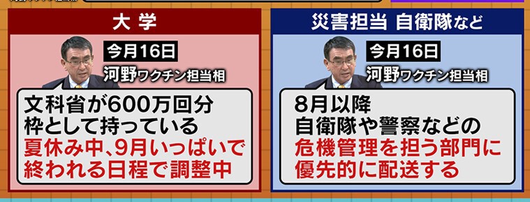 「多くは自治体の中で色々と警察を優先して打っていますが、まだ打てていない所があります。自衛隊の中で優先順位をつけて、災害派遣に行くような部隊は優先をして、そうでないところは少し後、という形で自衛隊に順番をつけてもらっています。それと並行して、夏休み中に大学生が打って新学期は対面で授業をやりたいという文科省の思いがあるので、大体空いている枠の3分の1ぐらいを大学に割り振るというような感じになってくるかと思います」