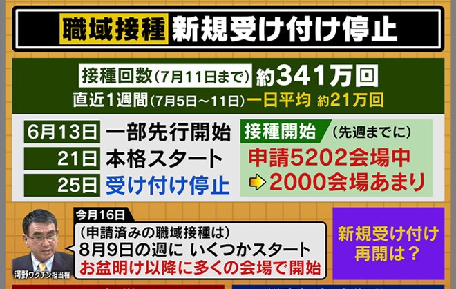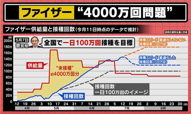 「自治体の皆様には色々迷惑をかけましたが、ワクチンの供給については当初の予定通りに入って来ています。9月の終わりまでに、国民の皆さん全員が2回打てる分のワクチンが入ってきます。想定外だったのは、総理が1日に100万回という目標を掲げた時に、私は正直かなり高いハードルだなと思いましたが、おそらく先週の時点で1日に全国で150万回ぐらい打っているという状況に今、なっていると思います。そのスピードですと、自治体にある未接種のワクチンをどんどん使い果たして、そのあとの供給が間に合わないという状況に先々でなっていきます。足元はまだ、予約されている分のワクチンがありますから、このペースでドンドン行けるのですが、これが8月、9月の予約を取っている自治体にしてみると、ホントに予約を取った分のワクチンが入ってくるのか、そこが足らないならその分の予約をキャンセルする、あるいは先々の予約を取るのを停止せざるをえないという状況になっていますが、これは今、8月の末まで、それぞれの自治体にこれだけの数を送りますということを示したので、今までよりは少しペースダウンにはなりますが、今後はしっかり、予約を取れるようになっていくのではないかと思います」