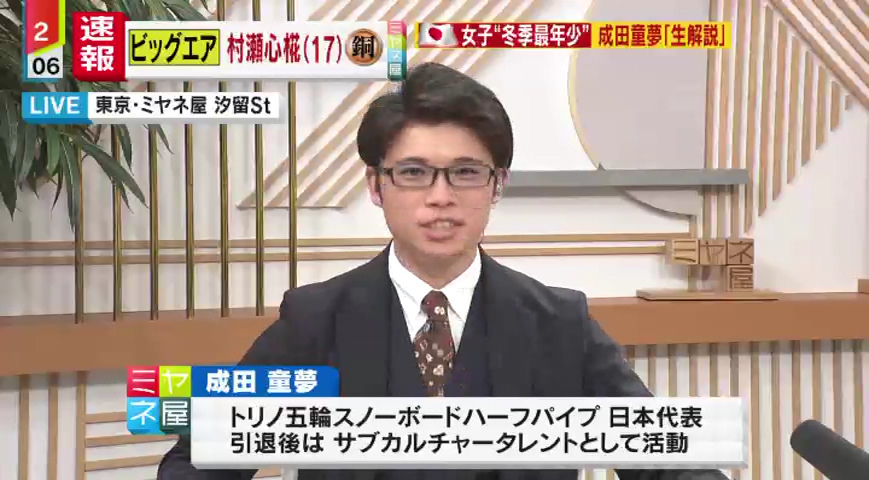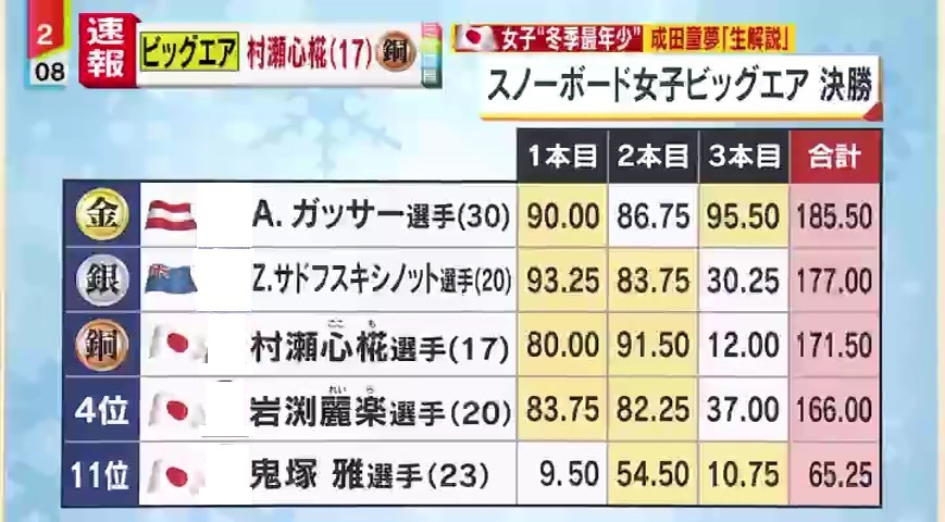 北京五輪スノーボード女子ビッグエアで17歳の村瀬心椛(むらせ ここも)選手が銅メダルを獲得しました。17歳でのメダル獲得は、2010年バンクーバー五輪の浅田真央さんの当時19歳を上回る、冬季五輪史上日本女子最年少記録となりました。村瀬選手は4歳でスノーボードを始めて、平昌五輪は年齢制限で出られませんでしたが、今回、日本選手団で最年少での参加となりました。しかし2018年 『X Games(エックスゲームズ)』ビッグエアでは、わずか13歳で平昌五輪の金メダリストなど並み居る強豪を抑え優勝、2021年ワールドカップでも優勝をしています。」