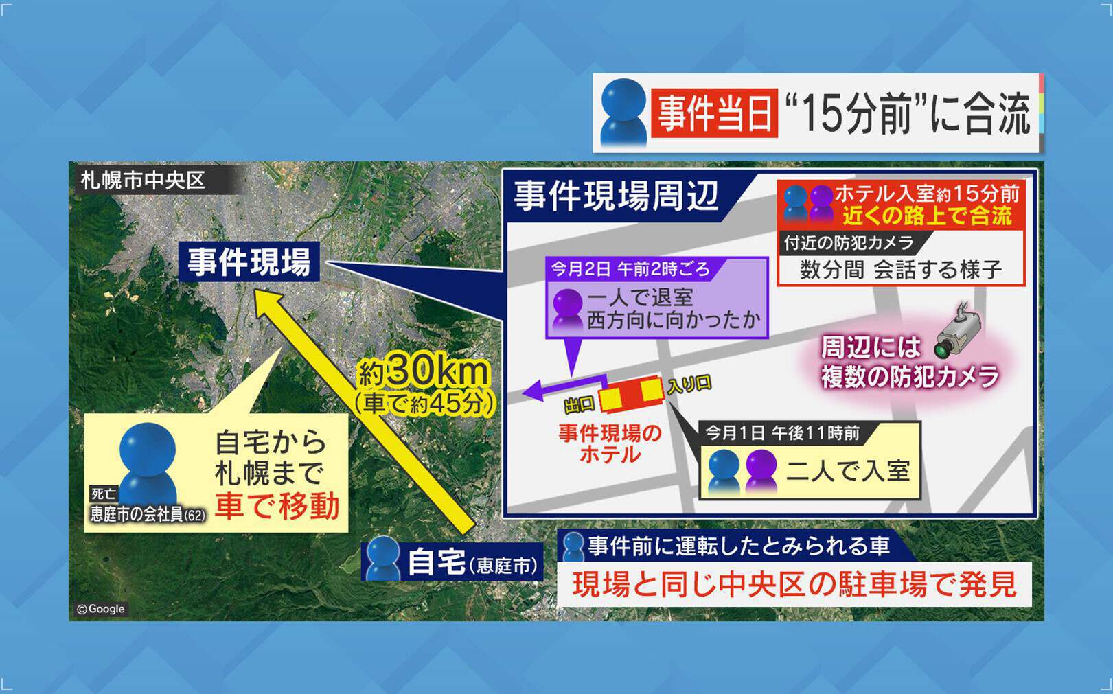 7月1日の午後11時前に、二人はホテルに入っています。そしてその入室の約15分前に、近くの路上で合流して数分間会話する様子が防犯カメラに映っていたということです。