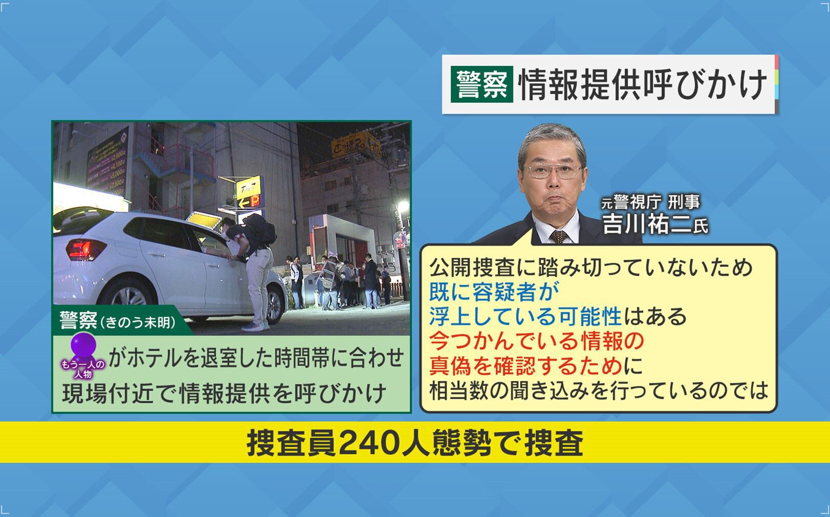 現在240人態勢で捜査が行われていて、現場付近では情報提供が呼びかけられています。一方、吉川氏は「公開捜査に踏み切っていないため、既に容疑者が浮上している可能性はある。今つかんでいる情報の真偽を確認するために、相当数の聞き込みを行っているのでは」と話しています。