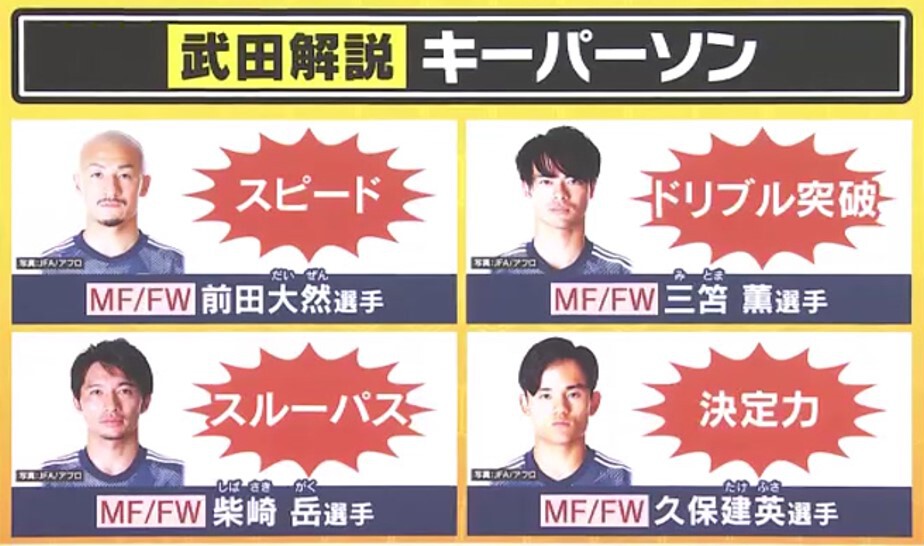 武田さんは、スペイン戦のキーパーソンとして、4人の選手に期待しています。まずはスピード勝負の前田大然選手、ドリブル突破が得意な三笘薫選手、柴崎岳選手のスルーパス、そして久保建英選手の決定力にも注目ということです。