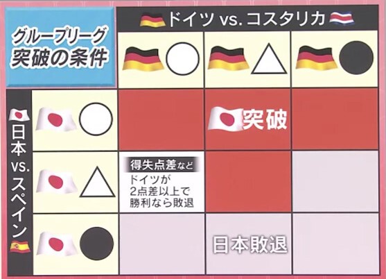 日本は、12月2日に行われるスペイン戦に勝てば無条件で決勝トーナメント進出が決まり、負ければグループリーグ敗退となります。引き分けた場合は、ドイツvs.コスタリカ戦の結果次第となり、ドイツが引き分けだった場合は決勝進出となりますが、ドイツが2点差以上で勝利なら敗退してしまいます。