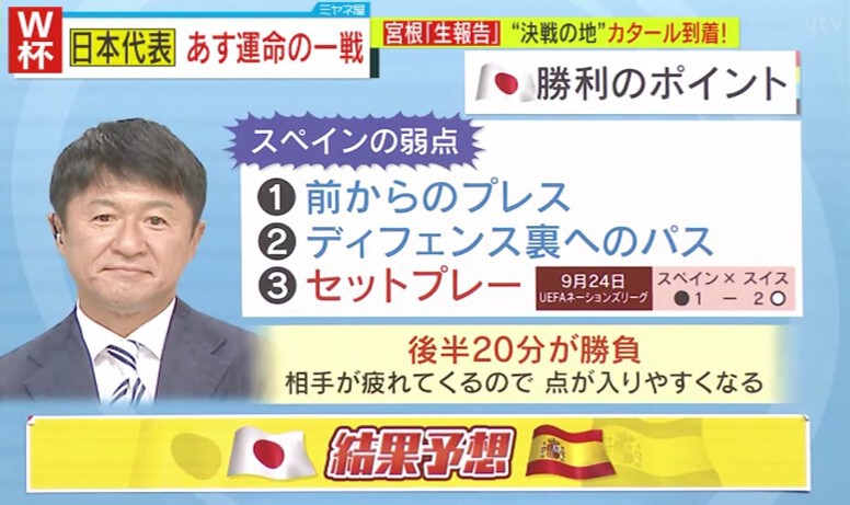 武田さんは、スペインの弱点は、①前からのプレス、②ディフェンス裏へのパス、③セットプレー、としていて、相手が疲れてきて点が入りやすくなる「後半20分」が勝負だと言います。