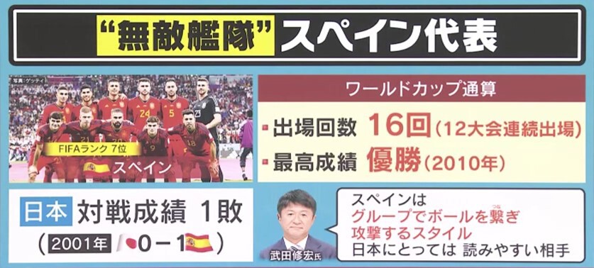対する“無敵艦隊”スペインは、FIFAランキング7位。ワールドカップには通算16回出場していて、12大会連続出場の経験もあります。最高成績は2010年の優勝で、日本は2001年に1敗しています。武田さんは「スペインはグループでボールを繋いで攻撃するスタイル。日本にとっては、実は読みやすい相手」だと言います。