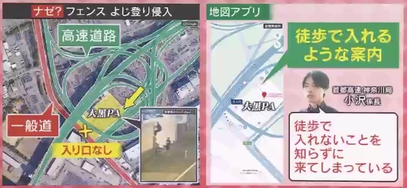 また、“フェンスのよじ登り”が起きる理由として、小沢係長は「徒歩で入れないことを知らずに来てしまっているのでは」と話しています。前提として、『大黒パーキングエリア』には一般道から入ることができず、高速道路から車で利用する必要があります。しかし、地図アプリの目的地に『大黒パーキングエリア』と入力すると、徒歩で入れるように見える案内が出るということです。