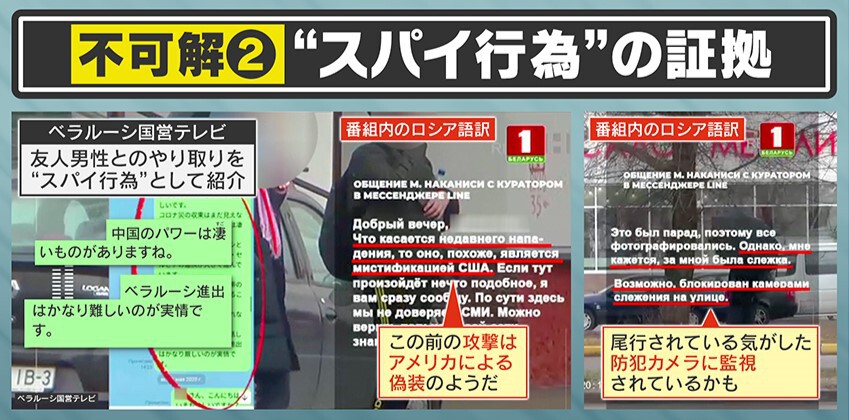 スパイ行為の証拠としてLINEでのやり取りが出されていますが、日本語とロシア語の訳が全く違っていて、日本語で「中国のパワーはすごいものがありますね」がロシア語では「この前の攻撃はアメリカによる偽装のようだ」になっていたり、日本語の「ベラルーシ進出はかなり難しいのが実情です」のロシア語訳が「尾行されている気がした、防犯カメラに監視されているかも」になっていたりします。