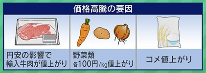 カレーの調理費用高騰の要因は、①円安の影響で輸入牛肉が値上がり、②人参やジャガイモなどの野菜類もそれぞれ1kgあたり100円の値上がり、③米の値上がり、となっています。
