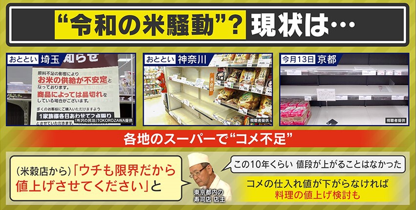 日本各地のスーパーで“米不足”により棚から商品がなくなっています。米の価格も高騰していて、東京都内にある寿司店の店主は、「(米穀店から)ウチも限界だから値上げさせてください」と言われたということです。「この10年くらい、値段が上がることはなかった」そうで、「米の仕入れ値が下がらなければ料理の値上げを検討せざるを得ない」ということです。