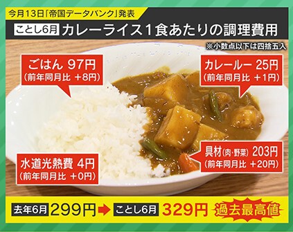 8月13日「帝国データバンク」が2024年6月のカレーライス一食あたりにかかる調理費用を発表しました。それによると、ごはんが97円で前年同月比+8円。カレールーが25円で前年同月比+1円。具材が203円で前年同月比+20円。水道・光熱費は4円で前年同月比+0円となっていて、合計は2023年6月が299円だったのに対して、2024年6月は329円で、+30円となって過去最高値を記録しました。