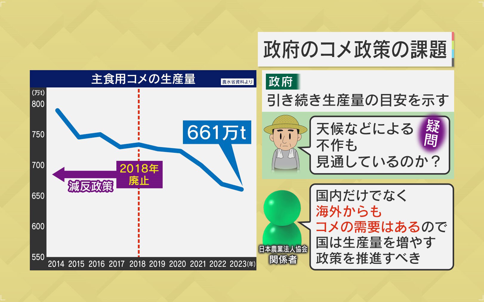 2018年に約50年続いた「減反政策」は廃止されましたが、その後も米の生産量は減っています。そして、政府は引き続き、生産量の目安を示して、増産して良いような状況ではありません。農家からは、「天候などによる減少量まで見通して目安を出していたのか?」という疑問の声もあるといいます。日本農業法人協会の関係者は「国内だけでなく海外からも米の需要はあるので、国は生産量を増やす政策を推進すべき」といいう声もあります。