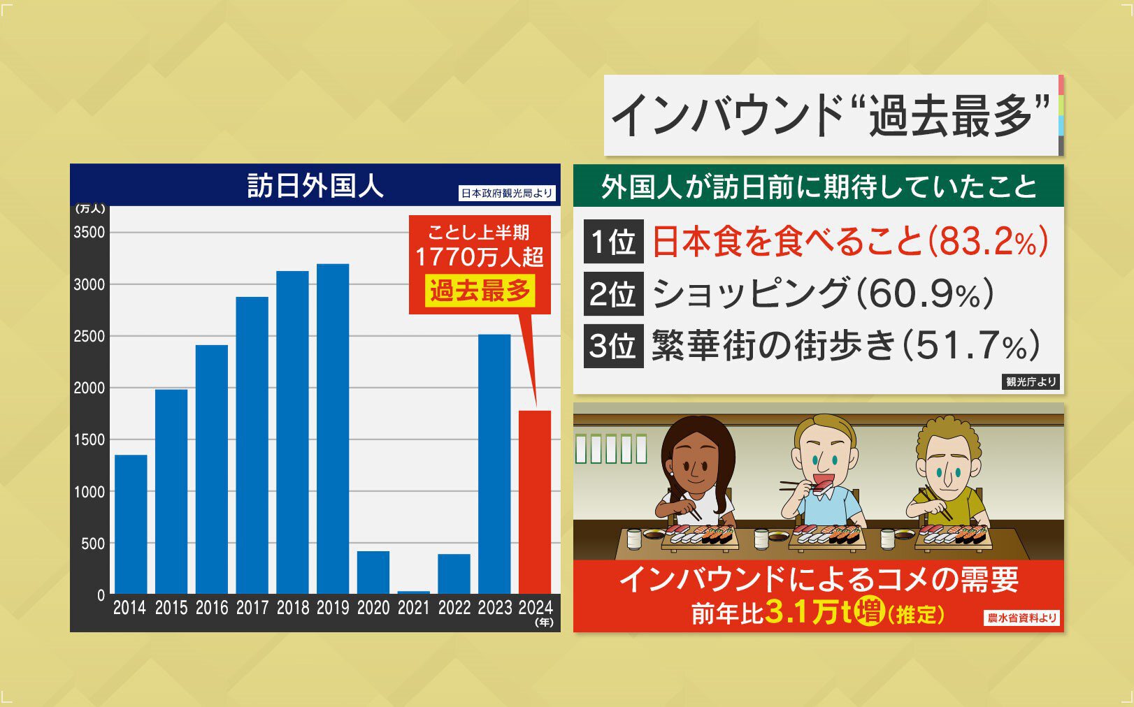 2024年上半期の訪日外国人が1770万人超と過去最多となりました。その外国人が訪日前に期待していたことの第1位が「日本食を食べること」だといいます。そのためか、インバウンドによる米の需要は前年比3.1万t増だと推定されています。