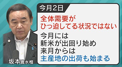 米“不足”と“高騰”解消のメドですが、8月2日、坂本哲志農水相は「全体需要がひっ迫してる状況ではない。8月には新米が出回り始め、9月からは主産地の出荷も始まる」とコメントしています。
