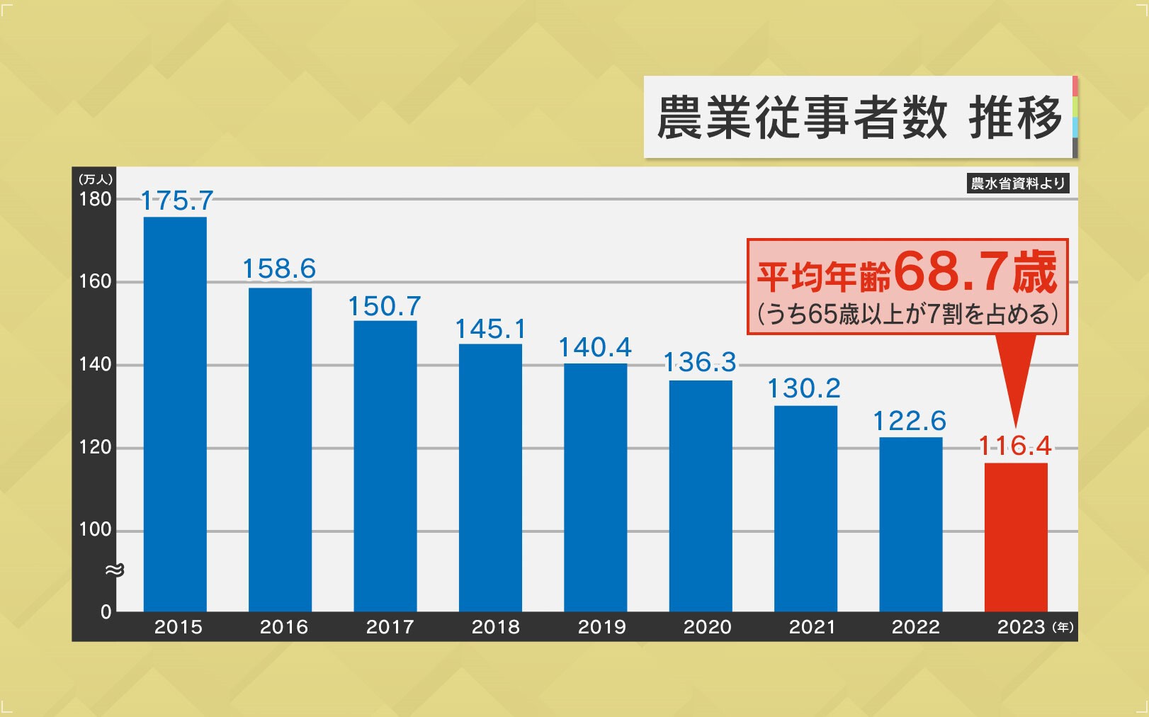 ただ、農業従事者は減っている上に、平均年齢が68.7歳、うち65歳以上が7割を占める状態で高齢化が進み、後継者も不足しているといいます。