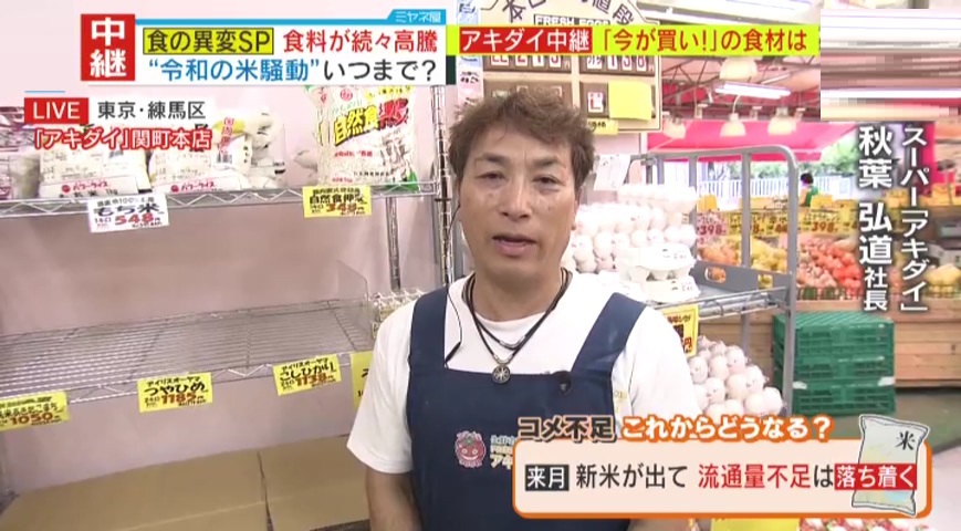 スーパー「アキダイ」の秋葉弘道社長は、「店によってはもう新米は出ている。自分の店にも入荷の予定だ。価格は下がらないと思うが商品は供給されるので、そんなに焦らないで良いのでは?」と話しています。