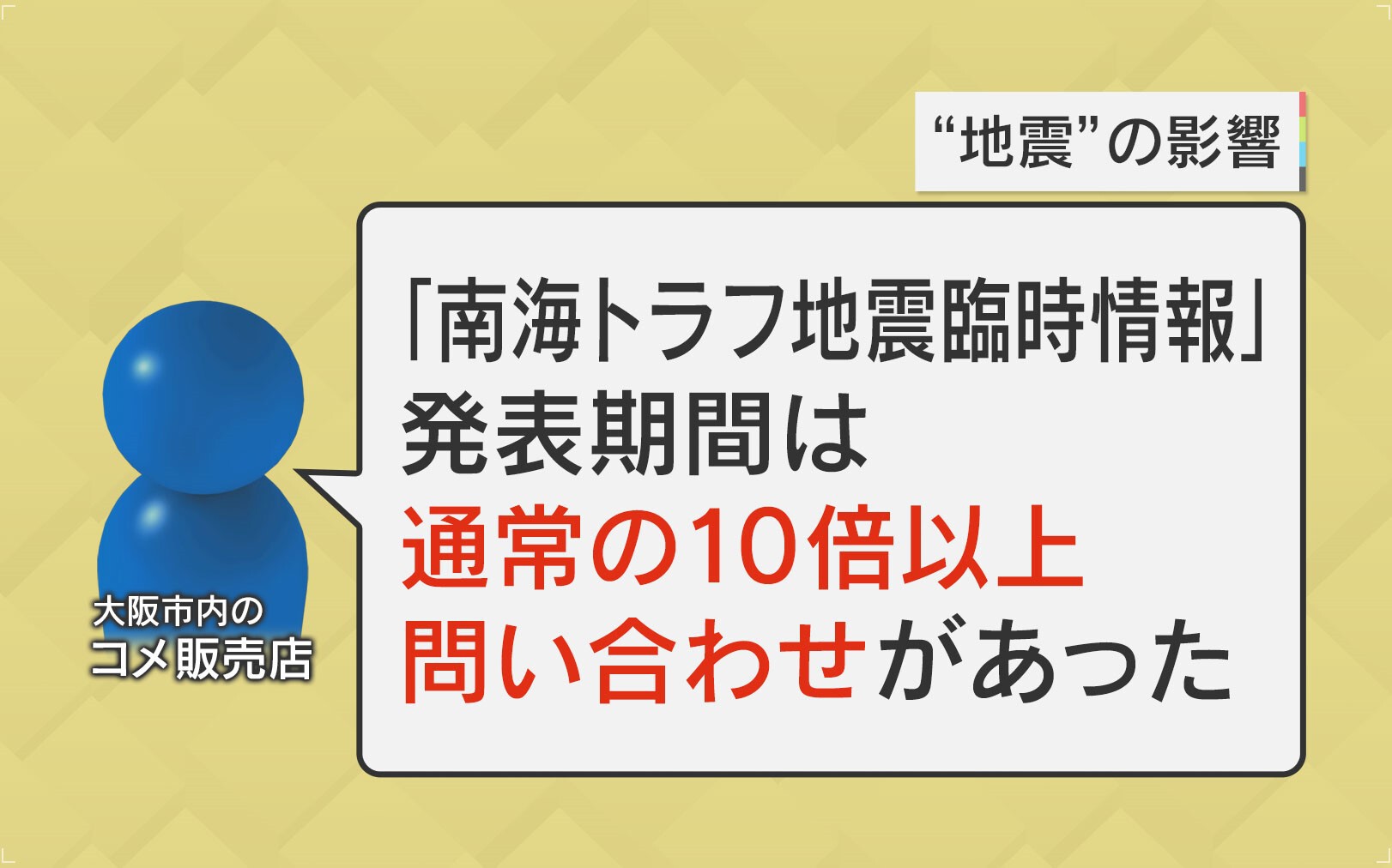 大阪市内の米販売店によると「『南海トラフ地震臨時情報』発表期間は、通常の10倍以上問い合わせがあった」ということです。