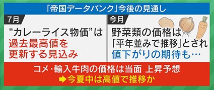 「帝国データバンク」によると、7月のカレーライス物価は過去最高値を更新する見込みだということですが、8月に関していえば、野菜類の価格は『平年並みで推移』とされ値下がりも期待されています。しかし、米・輸入牛肉の価格は当面の間上昇が予想されており、この夏の間は高値で推移するとみられています。