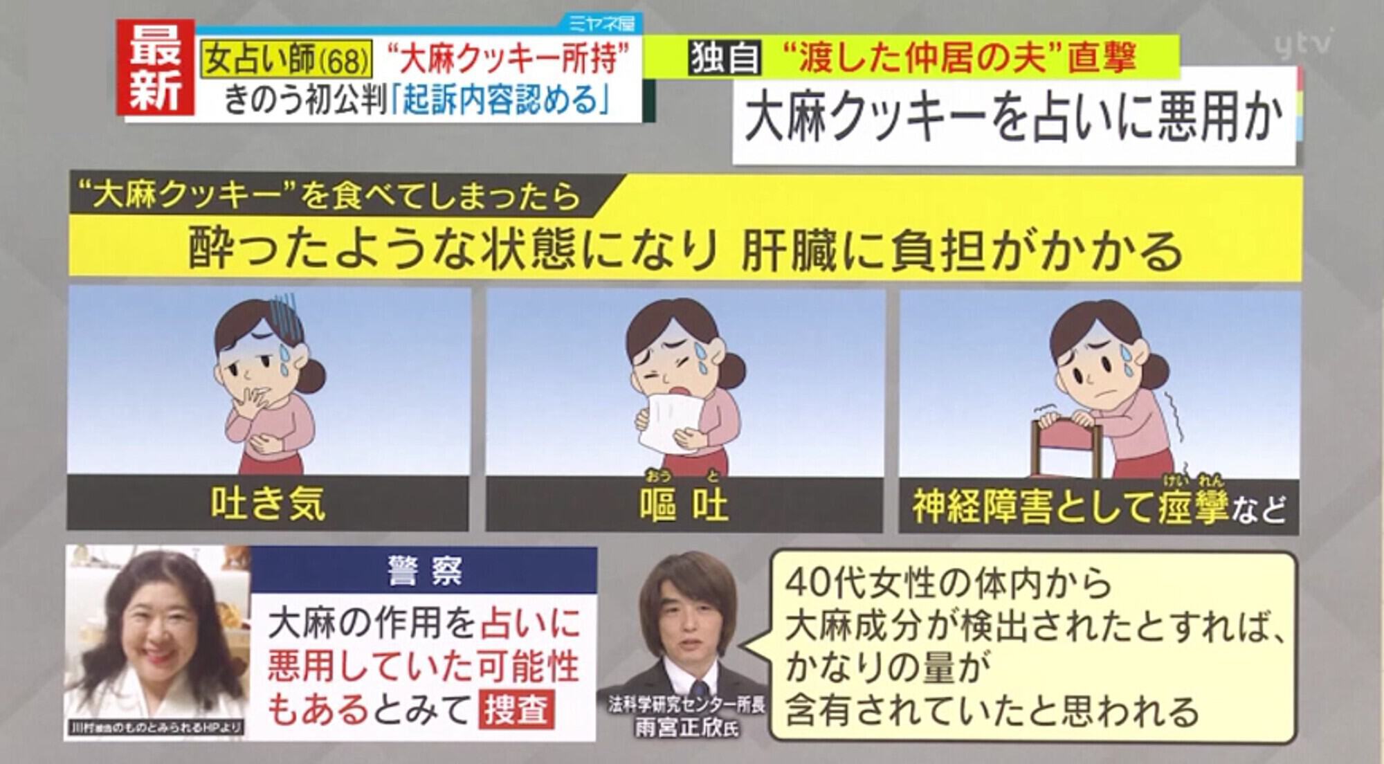 法科学研究センター所長の雨宮正欣氏によると、“大麻クッキー”を食べると、酔ったような状態になり肝臓に負担がかかるということです。また、人によっては吐き気・嘔吐・神経障害として痙攣などが起こることがあるとしています。警察は、大麻の作用を占いに悪用していた可能性もあるとみて捜査しています。