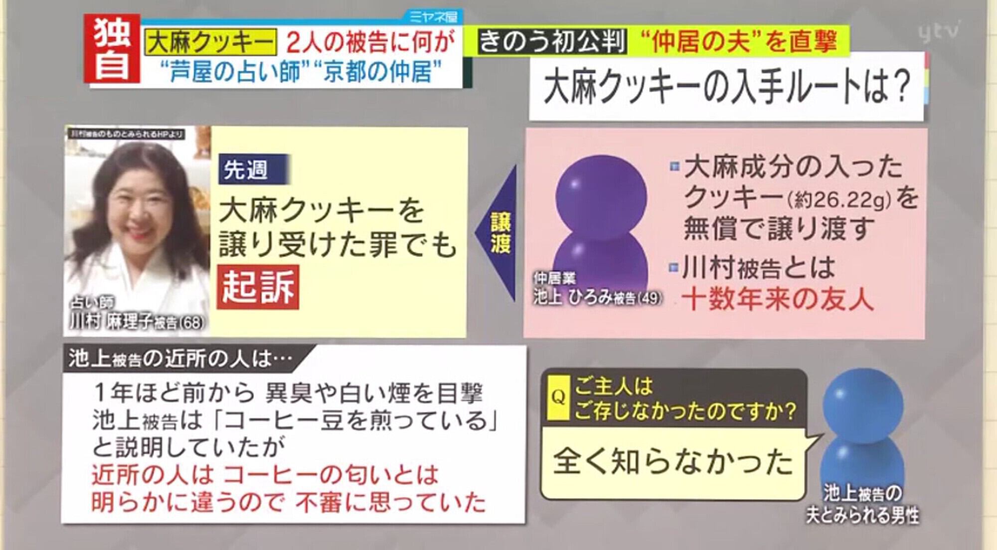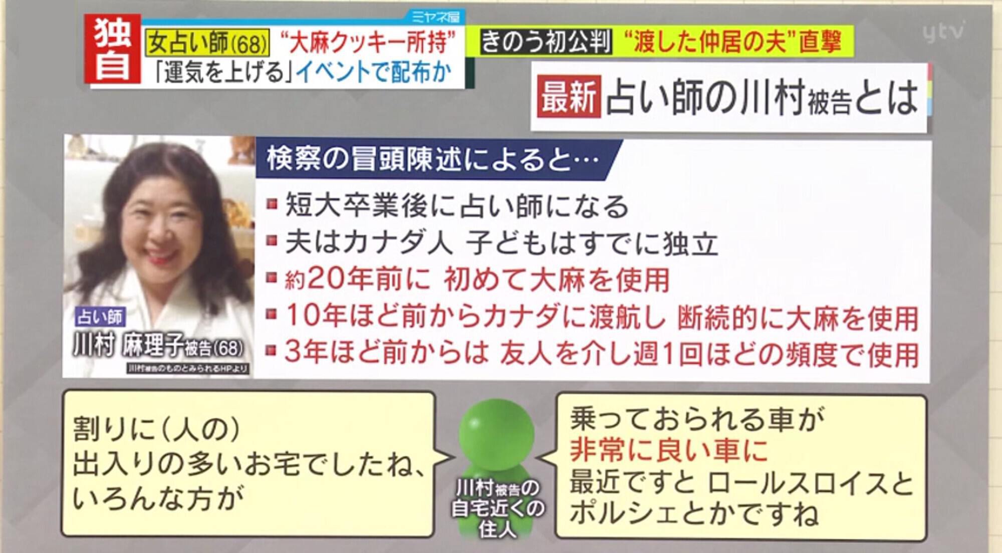 初公判の検察の冒頭陳述によると、川村被告は短大卒業後に占い師になりました。夫はカナダ人で、子どもはすでに独立しています。約20年前に初めて大麻を使用、10年ほど前からカナダに渡航し、断続的に大麻を使用していたということです。3年ほど前からは友人を介し、週1回ほどの頻度で使用していたということです。川村被告の自宅近くに住む人は「人の出入りの多い家だった。乗っている車が非常に良い車で、ロールスロイスやポルシェだった」と話しています。