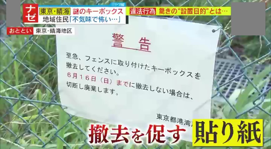 晴海地区にはオートロックのマンションが多く、鍵なしでは中に入れないため、警視庁によると「不動産業者が内覧のために使用しているのではないか」ということです。ただ、キーボックスを勝手に付けることは認められていません。別の地域でも確認されているということで、関係各所と協議し、貼り紙をするなど撤去を促しています。