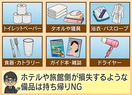 宿泊先で欠かせないのが『アメニティー』です。アメニティーには『トイレットペーパー』『タオルや寝具』『浴衣・バスローブ』『食器・カトラリー』『ガイド本・雑誌』『ドライヤー』が含まれますが、亀井弁護士によると、ホテルや旅館側が損失するような備品は持ち帰りNGということです。