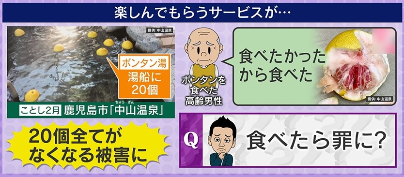 一方、2025年2月、鹿児島市『中山(ちゅうざん)温泉』では、『ボンタン湯』として湯船に浮かべていたボンタン20個が全てなくなる被害に遭いました。ボンタンを持ち去った高齢男性は、「食べたかったから食べた」と話したということです。
