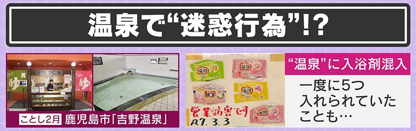 2025年2月、鹿児島市『吉野温泉』で、“温泉”に入浴剤が混入されました。一度に5つ入れられていたことも…。元検事・亀井正貴弁護士によると、温泉に入浴剤を混入させたら、『器物損壊罪』や『偽計業務妨害罪』となる可能性があるということです。