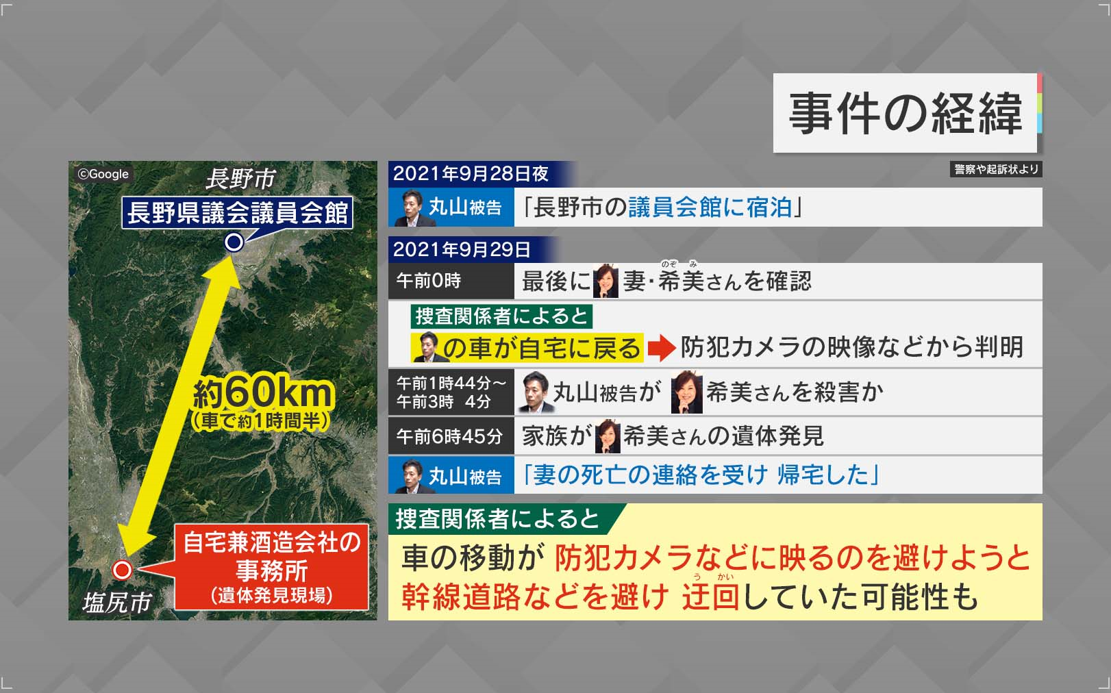 2021年9月29日午前6時45分、長野・塩尻市の丸山被告の自宅兼酒造会社の事務所で、妻・希美さんが倒れているのが発見されました。当初、丸山被告は「事件前日の夜は長野市の議員会館に宿泊していた」と説明。しかし、捜査関係者によると、丸山被告の車が塩尻市にある自宅に戻っていたことが、防犯カメラの映像などから判明しました。