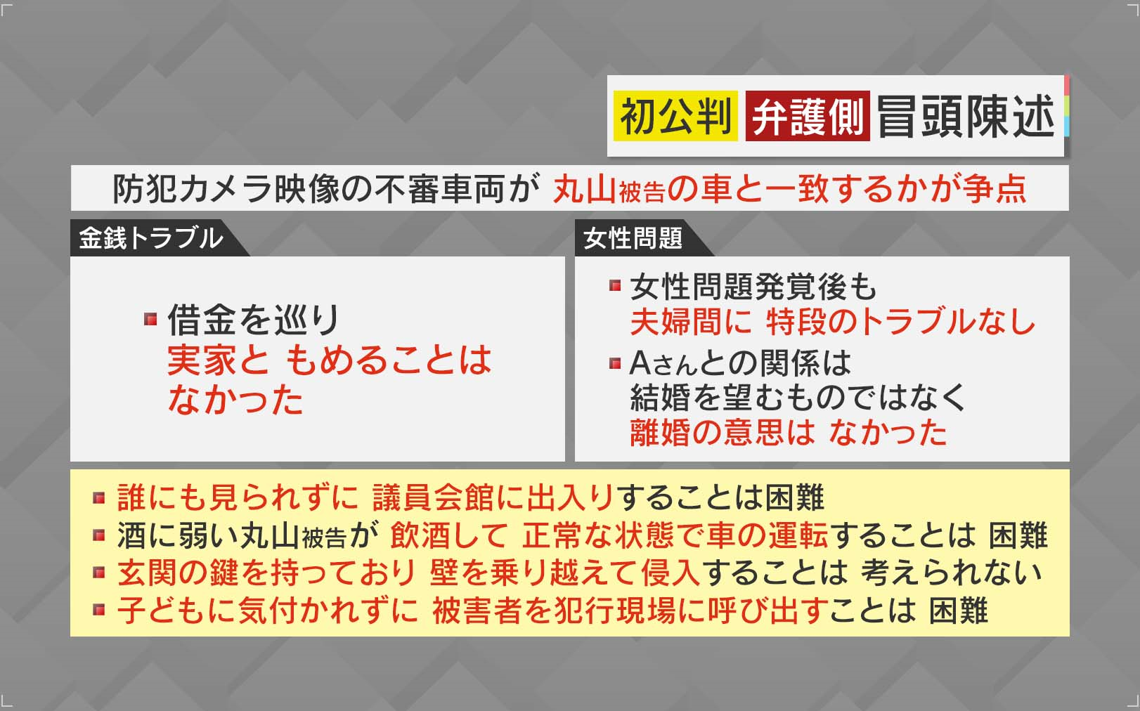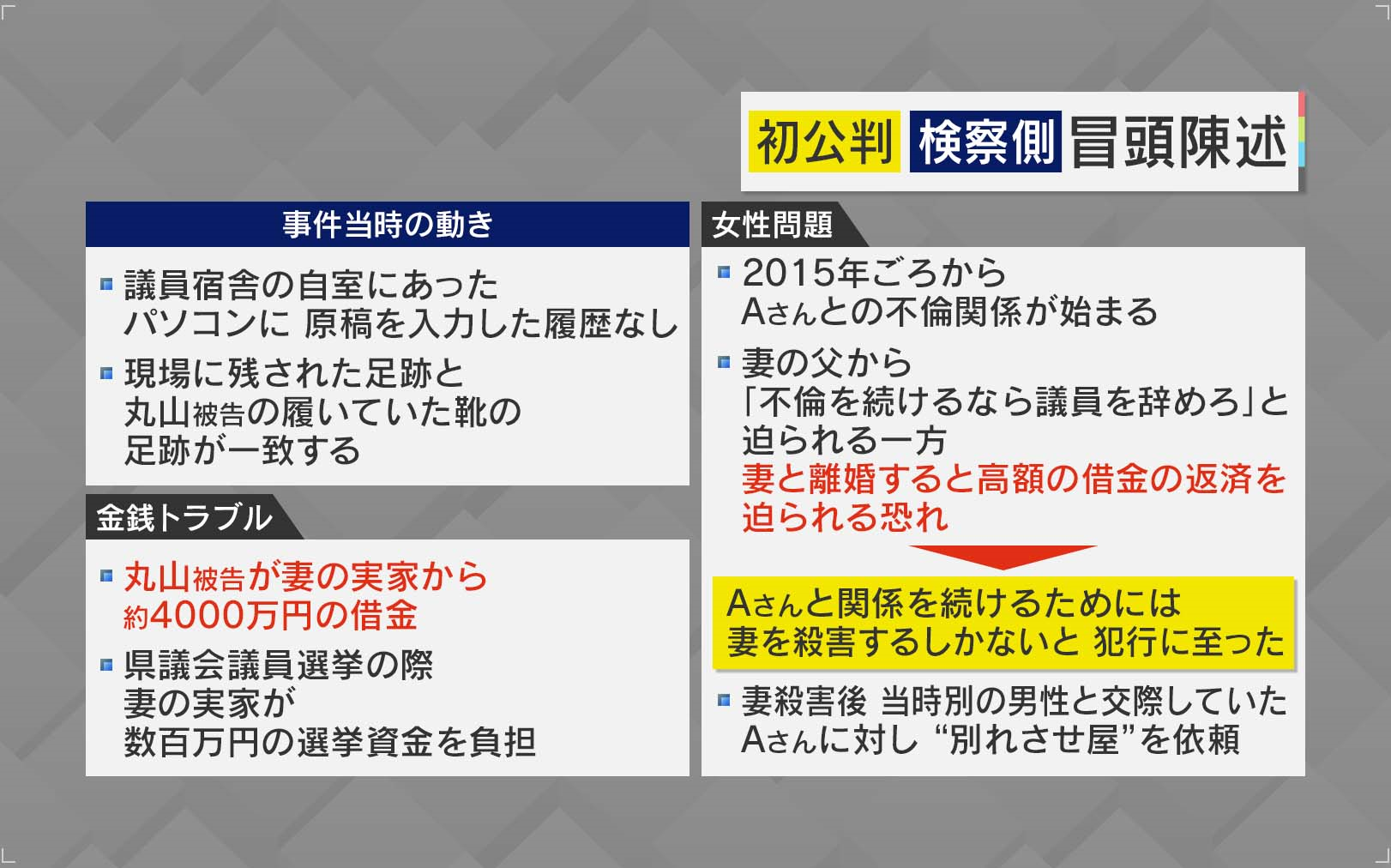 検察側は、丸山被告の心境として、「不倫相手・Aさんとの結婚を望んでおり、関係は続けたいが妻と離婚すると、妻の実家から借金の返済を求められたり、次の選挙で支援を受けられなくなるため、離婚できる状況ではなかった。妻を殺害する以外に道はなかったのではないか」と主張しました。