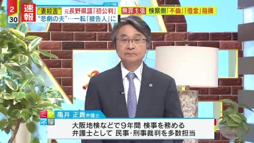 2021年、長野・塩尻市で妻を殺害したとして、殺人罪に問われている元長野県議会議員・丸山大輔被告。妻を亡くした“悲劇の夫”から一転、容疑者となった丸山被告。初公判では「妻を殺害したのは私ではありません」と無罪を主張し、起訴内容を否認。裁判の争点になる“4つのテーマ”とは?そして無罪主張する「被告の“犯人性”」とは?元検事・亀井正貴弁護士の解説です。