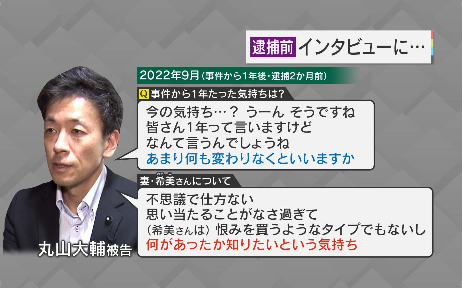 事件から1年後の2022年9月、逮捕前のインタビューで丸山被告は、「今の気持ち…?うーん、そうですね。皆さん1年って言いますけど、なんて言うんでしょうね。あまり何も変わりなくといいますか」と語り、妻・希美さんについては「不思議で仕方ない。思い当たることがなさ過ぎて、(希美さんは)恨みを買うようなタイプでもないし、何があったか知りたいという気持ち」と語っていました。