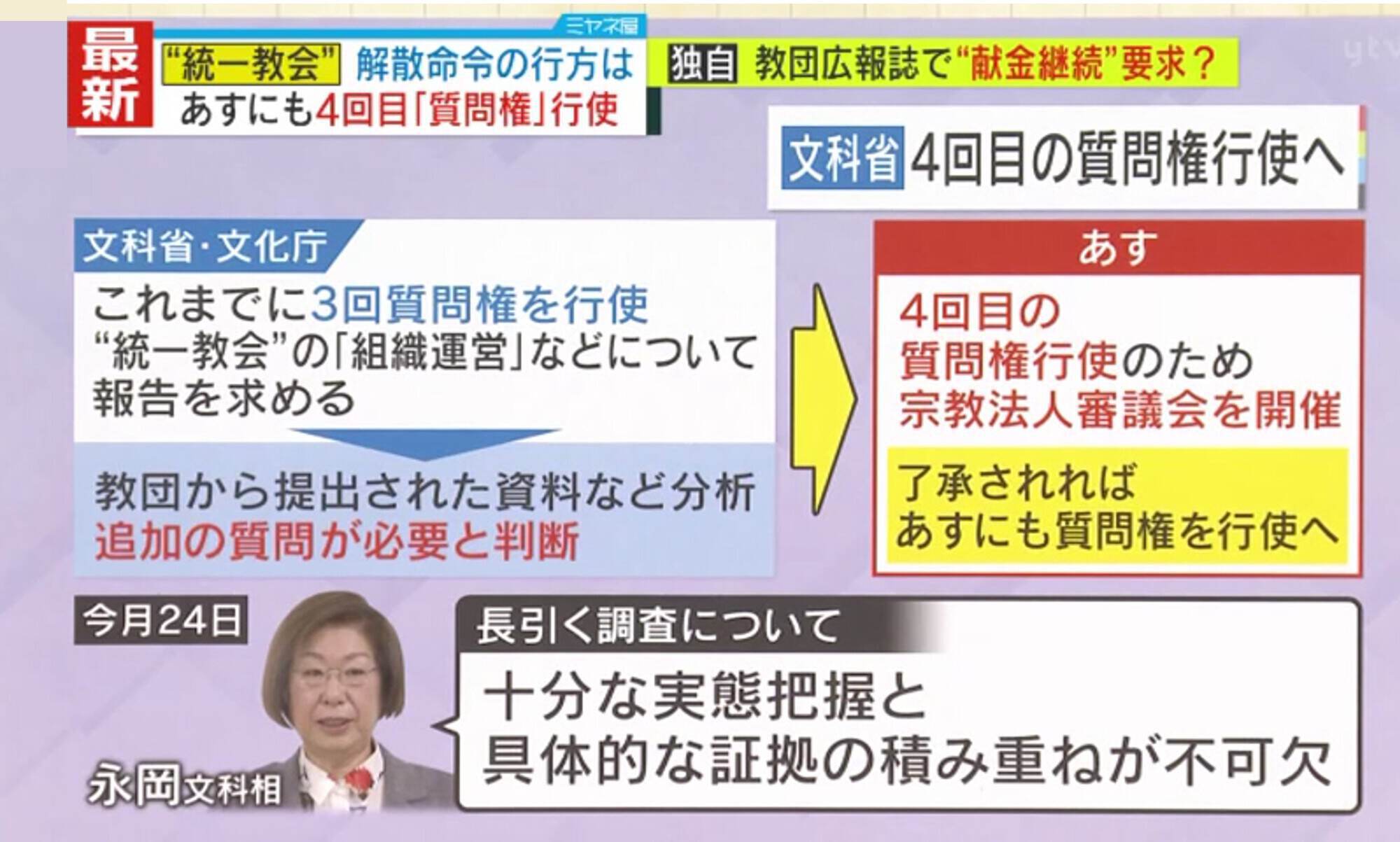 文科省・文化庁は2月28日、4回目の質問権行使のために宗教法人審議会を開催し、了承されれば同日中に質問権を行使すると発表しています。