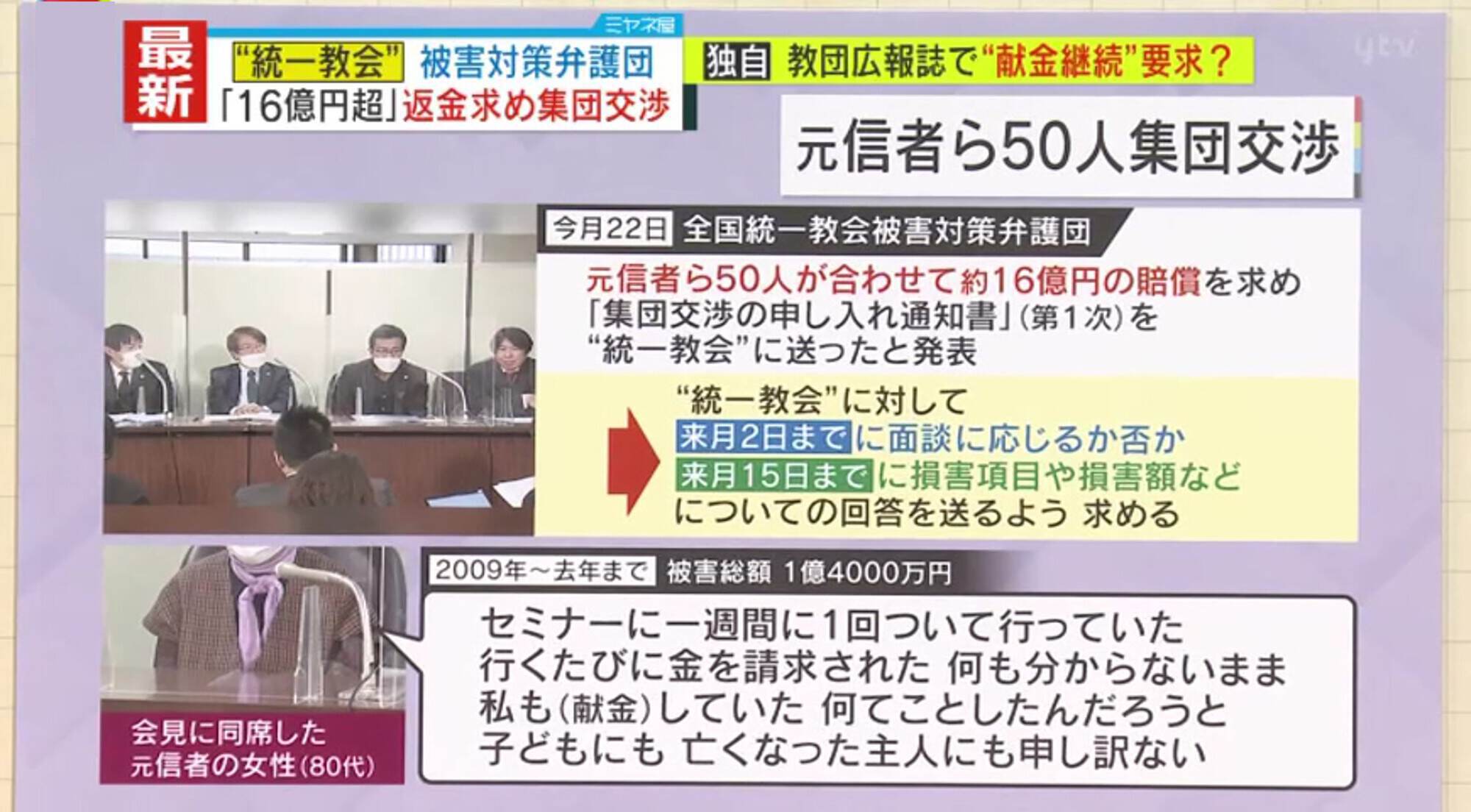 2月22日、全国統一教会被害者対策弁護団は、元信者ら50人が合わせて約16億円の賠償を求め「集団交渉の申し入れ通知書」(第1次)を教団に送ったと発表しました。“統一教会”に対して、3月2日までに面談に応じるか否かを、さらに3月15日までに損害項目や損害額などについての回答を送るよう、求めたということです。