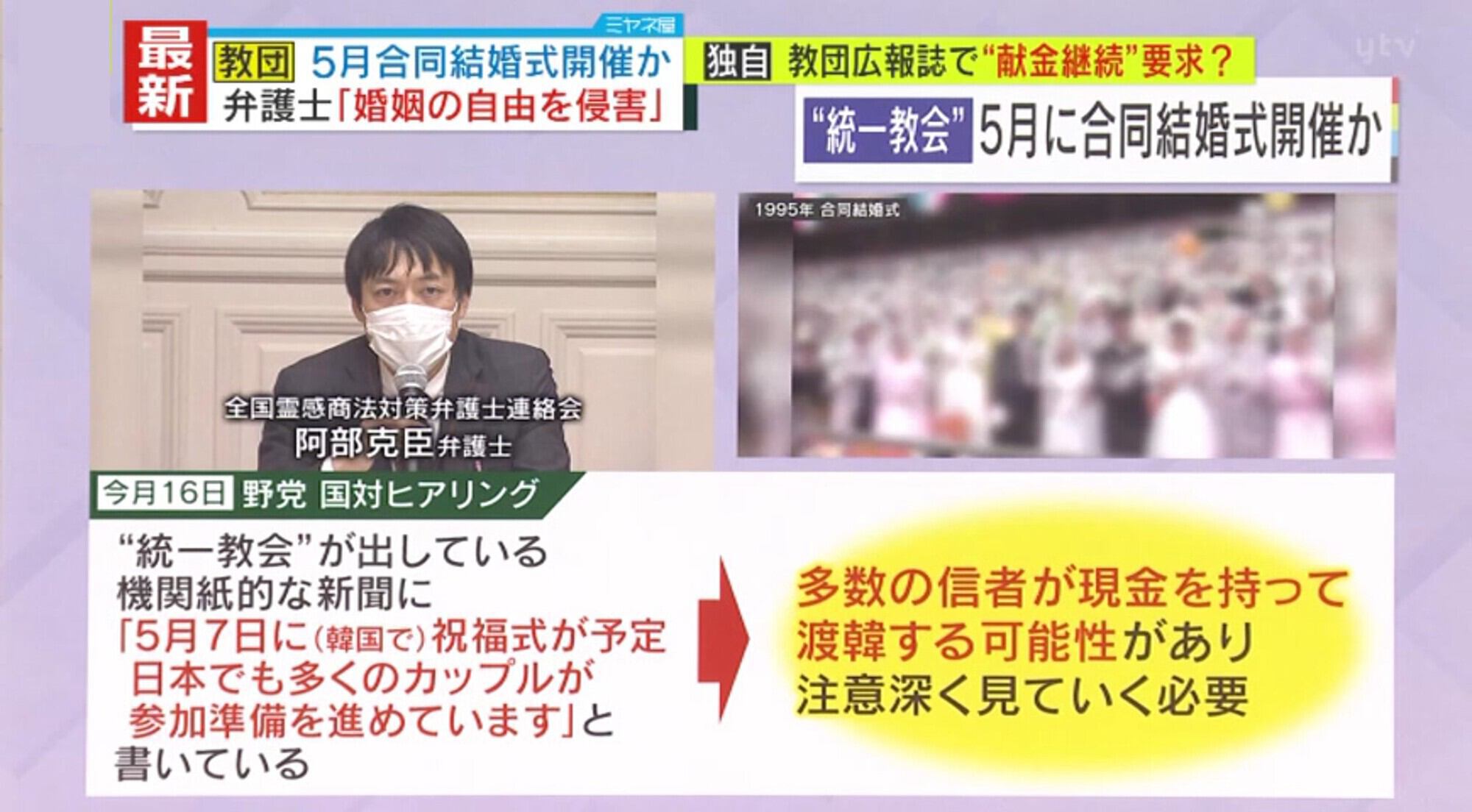 さらに、2月16日の野党国対ヒアリングで、全国霊感商法対策弁護士連絡会の阿部克臣弁護士は「“統一教会”が出している機関紙的な新聞に、『5月7日に(韓国で)祝福式が予定日本でも多くのカップルが参加準備を進めています』と書いている。多数の信者が現金を持って渡韓する可能性があり、注意深く見ていく必要がある」と警鐘を鳴らしています。