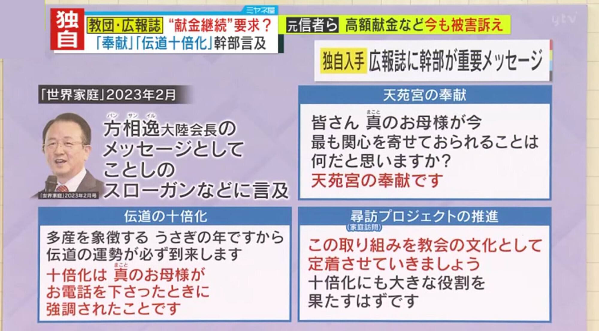 4回目となる質問権行使の動きも控える中、教団が今も信者らに継続して献金を求めている疑いが浮上しています。「ミヤネ屋」が独自入手した教団の広報誌「世界家庭」最新号には、方相逸(パン・サンイル)神日本大陸会長のメッセージとして、今年のスローガンなどに言及した文章が掲載されています。現在韓国で建設中の「天苑宮」について、方(パン)大陸会長は「皆さん、真のお母様(韓鶴子氏)が今最も関心を寄せておられることは何だと思いますか?天苑宮の奉献です」としています。鈴木氏は「天苑宮は内装がまだ完成しておらず、イタリア製の高級な資材を使うということで400~600億円足りないと言われています。『さらに献金を納めなさい』という“献金指令”と同一だと思います」と話しています。