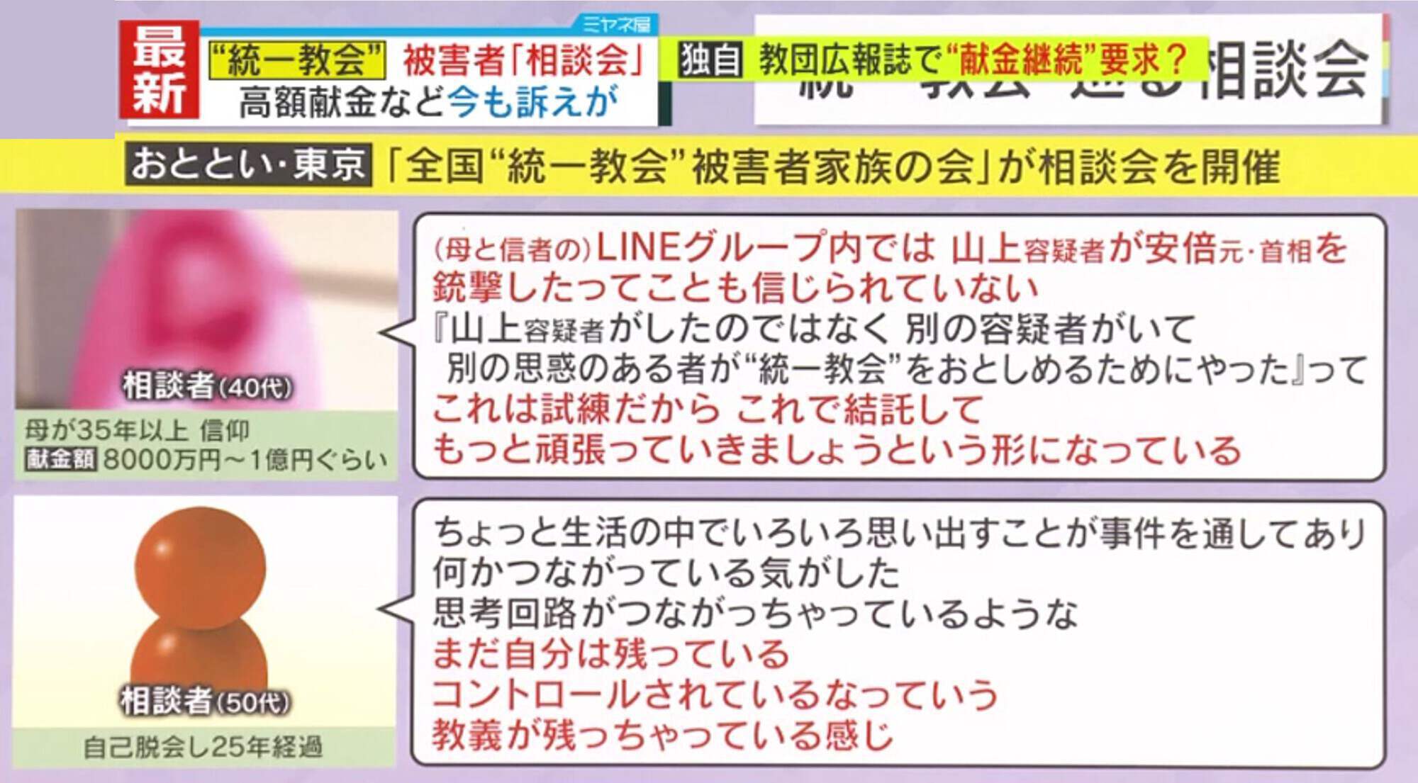 2月25日、東京都内で「全国“統一教会”被害者家族の会」が相談会を開催し、“統一教会”について被害を訴える元信者や信者の家族らが相談に訪れました。母が35年以上信仰し、献金額は8000万円~1億円ほどだという40代の相談者は「(母と信者の)LINEグループ内では、山上容疑者が安倍元首相を銃撃したことは信じられていない。『山上容疑者がしたのではなく、別の容疑者がいて、別の思惑のある者が“統一教会”をおとしめるためにやった』『これは試練だから、これで結託してもっと頑張っていきましょう』という形になっている」と話しました。また、自己脱会し25年が経過した50代の相談者は「まだ自分には残っている、コントロールされているなという。教義が残っている感じ」と心情を明かしました。
